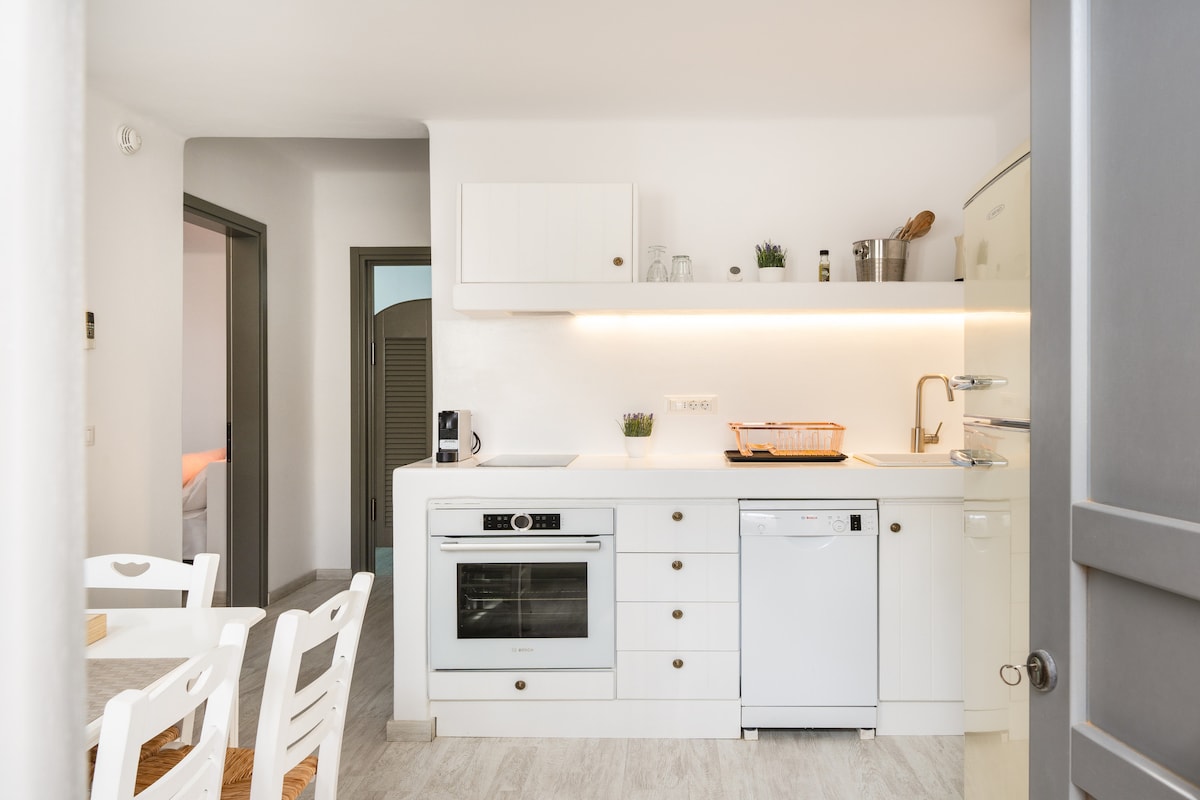 White Villa er et utmerket boutiquehus for en stor familie, som ligger over havet. Den består av en stor stue, stor balkong med privat jacuzzi/boblebad, tre dobbeltrom med dobbeltsenger (ett av dem med et loft med to enkeltsenger for barn) og ett rom med to enkeltsenger, to bad og eget bad. Huset har fullt utstyrt kjøkken. Den hvite villaen er en del av Captain Zeppos Boutique Suites og villakomplekset ved vannkanten av landsbyen Pollonia.