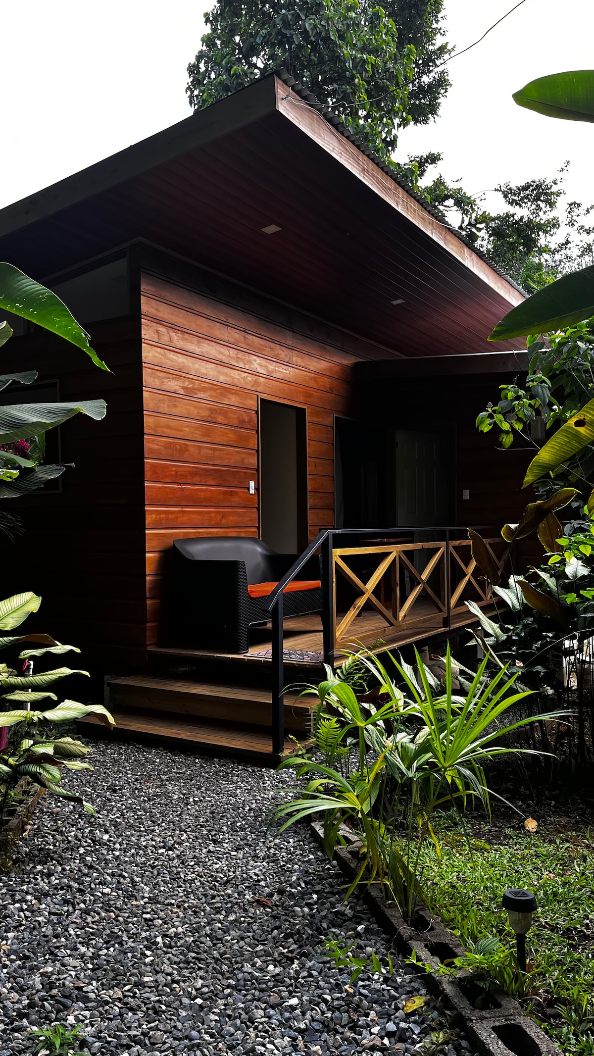 Våkn opp til fuglekvitring og hilse på solnedgangen med lyden av aper og andre typiske regnskogsdyr i denne åpne, håndlagde hytta laget av lokalt treverk, 300 m fra en av de vakreste strendene i Sør-Stillehavet, Playa Chamán. Hytta har to etasjer, nede et åpent rom med stue, spisestue, kjøkken, en dusj omgitt av planter og en liten terrasse. Ovenpå er det et romslig soverom med myggnetting og en balkong med en utrolig utsikt og hengekøye.