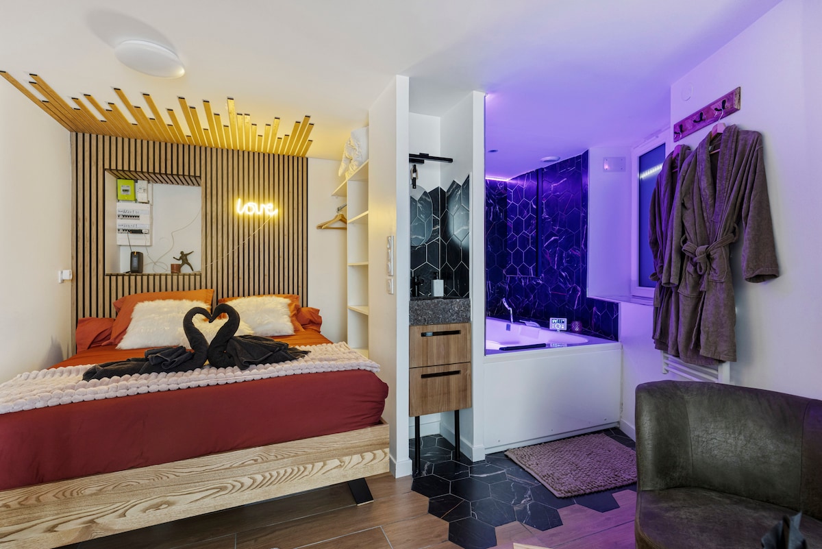 Unn deg en uforglemmelig ferie i vårt totalrenoverte Love Room. Designet for å gi deg en unik og tidløs opplevelse. Denne intime og innbydende boligen har en toppmoderne kinolærred, slik at du kan nyte dine favorittfilmer og serier i en koselig atmosfære. Boblebadet inviterer deg til et øyeblikk av total avslapning, ideelt for å lade batteriene. To skritt fra de beste restaurantene. Bestill nå og la magien virke!