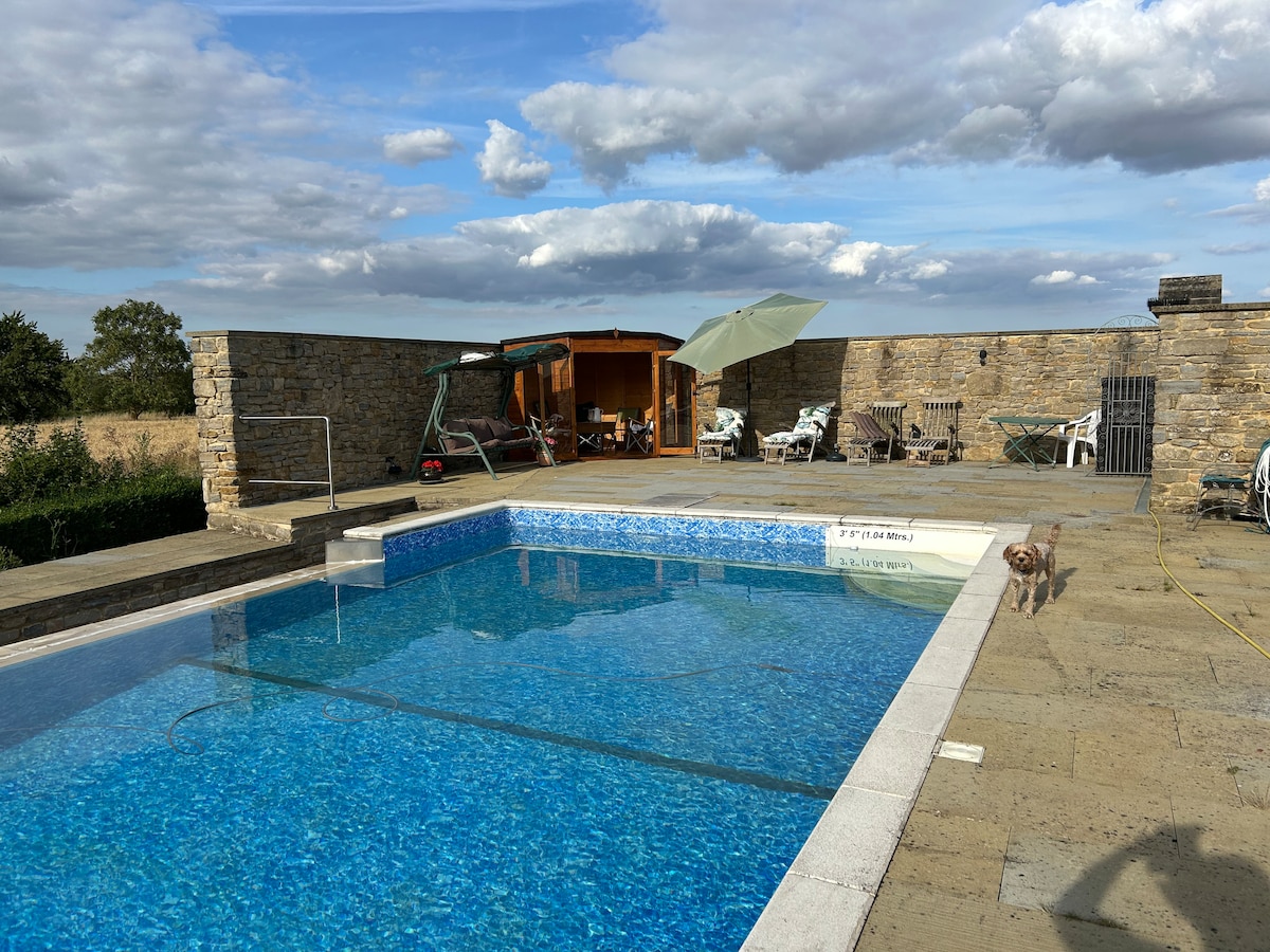 Take it easy at this peaceful & tranquil getaway with stunning 360 views of glorious open countryside yet just 2.5 miles from the lovely market town of Oundle & 5 miles west of the A1. Ideal for business travellers to Peterborough, Stamford or Corby or those seeking peace & relaxation in the heated outdoor infinity pool. There’s a great choice of foody pubs. Close to the Rutland border Our 1 bed annex has en suite bath & power shower, a wood burner, open plan kitchen and living area & patio
