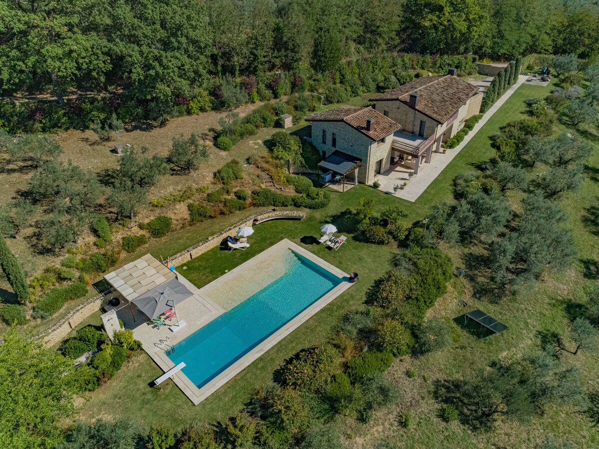 🌿 Grunner til at du vil elske dette huset: 🏰 Rolig villa. Nyt roen i et uavhengig hus og en inngjerdet hage. 🎨 Elegant interiør Blanding av glass, marmor og tre med ekspansive vinduer. 🌄 Panoramautsikt Slapp av med fantastisk utsikt. Soverom 🛏️ med tilgang til hagen. Våkn opp til naturen. 🚿 Luksuriøst bad. Romslig dusj i marmor og tre. 🧺 Klesvaskfasiliteter 💼 Arbeidsvennlig plass Internett med høy hastighet 📍 Prime Location 20 minutters gange eller 5 minutters kjøring til Perugias sentrum Varmt tilfluktssted!
