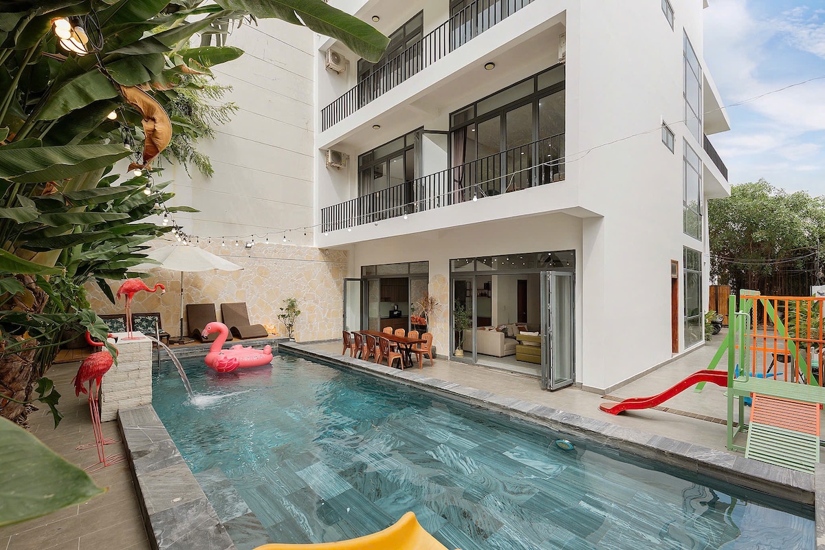 Quan Anh villa 2 200 kvm område (400 kvm brukbart område) 🏡 4 soverom, 6 senger, 4wc (6 dobbeltsenger). 1 etasje, 1 etasje, 1 garasje kan parkere 2 biler, 1 stor hage. 😘 egnet for grupper på 15-25 gjester 20 kvm🏊 svømmebasseng (1m4-1m8) 🎱 Biljard gratis Massasjestol 💸 (mot gebyr) 🍽️ Grill 🚘 Det er en parkeringsplass for to biler. Uteplass til grillkjøkken🍃, spisebord og stoler som gjestene kan spise og grille komfortabelt. 🌊 Villaen ligger 700 meter fra Back Beach.