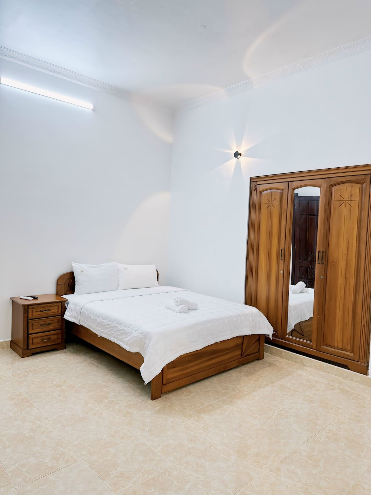 Det er et nytt rekkehus med én første etasje og to etasjer – 500 meter fra Bai Sau-stranden, og egnet for grupper på opptil tolv personer hvis du planlegger å utforske og slappe av i Vung Tau, men likevel ha en rimelig kostnad. Med en stor hage som har plass til en bil eller mer enn åtte motorsykler, trenger du ikke å bekymre deg for parkering eller å oppbevare bilen din. Dessuten er den romslige stuen, fullt møblert, kjøkkenutstyr … et rimelig sted for alle å samles, og fire romslige soverom for alle å hvile.