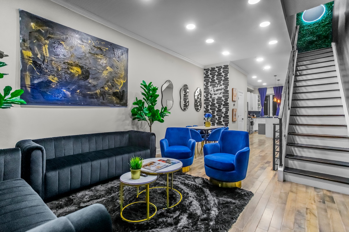 Nyt Philadelphia i dette sentralt beliggende Ultra Modern-hjemmet. Du trenger ikke å bekymre deg for parkering. Ved ankomst drar du inn i garasjen og går rett inn! Det er god plass til alle. Dette stedet har fem etasjer i stuen. Du vil bli møtt av en baby Grand Piano når du går inn i stuen. Det er en bakre uteplass i første etasje og en takterrasse med utsikt over Skyline & Bridge. I kjelleren finner du ditt eget kino. Ikke underholdt nok? Hva med en arkadelobby?!