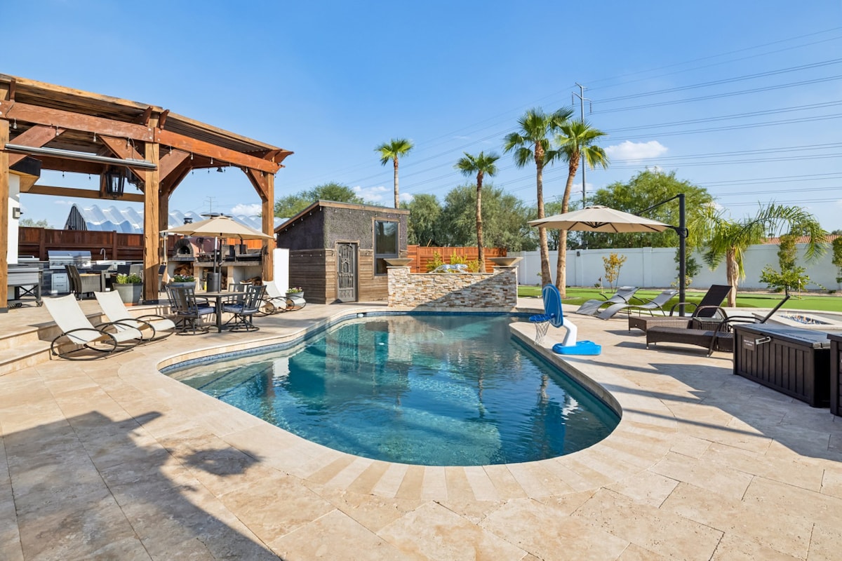 This 5-bedroom home is in a prime location and has everything you need for an amazing vacation in Phoenix, AZ! • Private Pool • Sportscourt: Basketball, Pickleball • Sauna • Fire Pit • Outdoor Patio/Dining • BBQ Grill • Putt Putt, Corn Hole & Giant Connect 4 • Game Room: Arcade Games, Pool Table, Foosball Table • Fully Stocked Kitchen • TVs in Each Bedroom • Dedicated Workspace • Board/Card Games • Outdoor Projector • Family Friendly- Pack n Play & High Chair • Washer & Dryer