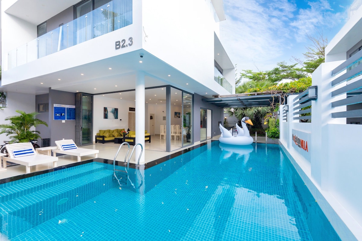 Villaen er nesten 2000 m2 med utendørs heis. – 100 m2 elektrolytisk saltvannsbasseng, samme ideelle hageområde – Separat festrom med biljardbord og moderne karaoke, noe som gir deg en lidenskap for å synge uten å måtte begrense lyden. – fullt kjøkken: induksjonskomfyr, stekeovn, kjøleskap – Praktisk beliggenhet: i nærheten av et marked med fersk sjømat, berømte restauranter og attraktive turistattraksjoner. – Fleksibel kapasitet: Villaen har åtte soverom, ni kingsize-senger, ti toalett og ekstra madrass, standard 18 gjester.