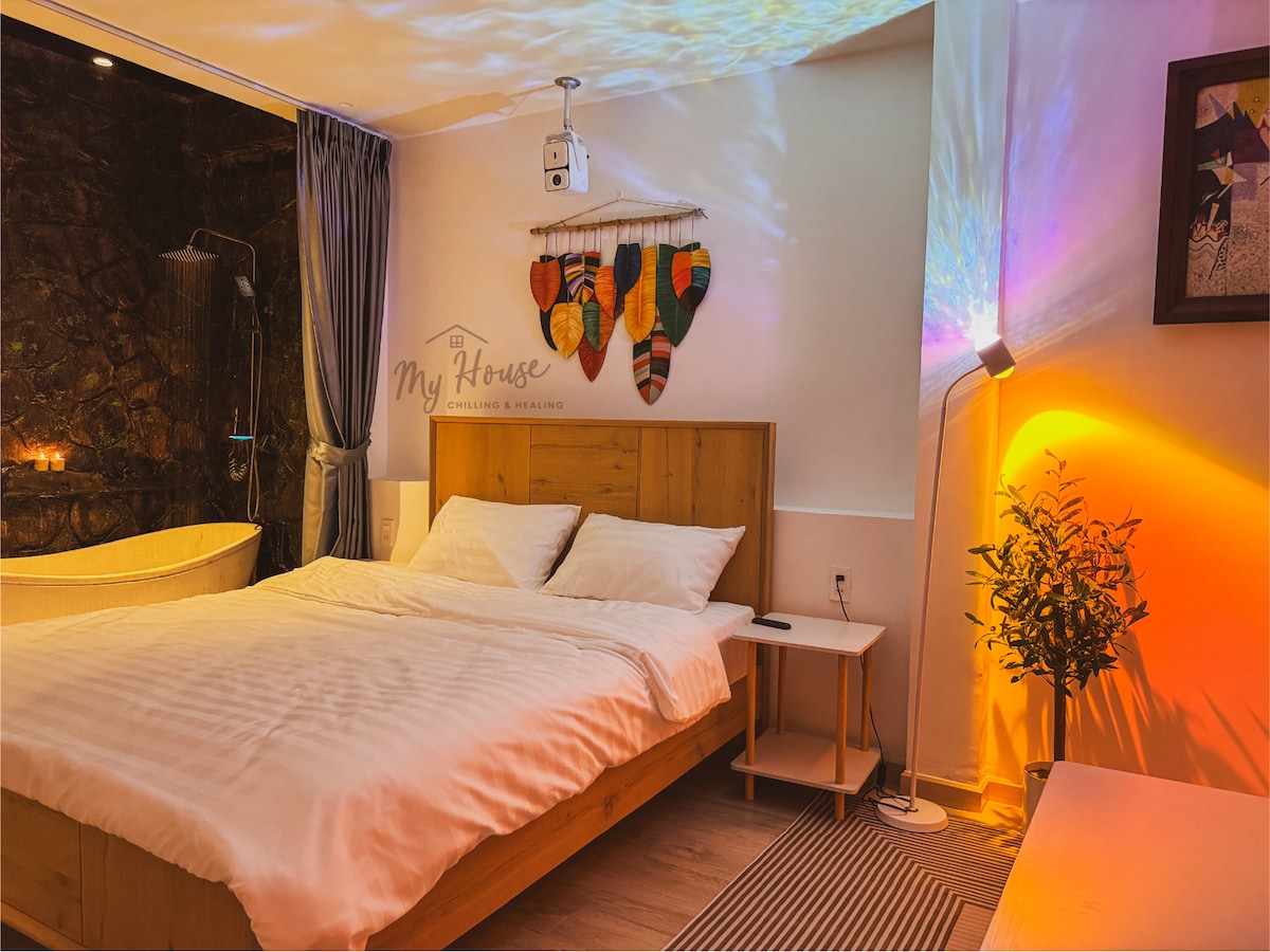 Jeg håper dette stedet gjør turen din mer meningsfull! Et sted som ikke bare er som hjemme, men også interessant å oppleve i Saigon 😊 Et romslig sted med nesten ting du trenger. 🌵Privat romslig bad 🌵TV med Android-boks Netflix 4K 🌵Kingsize-seng 180 cm 🌵Minibar med mikrobølgeovn 🌵Farlig bakgrunn for bildene dine 😉
