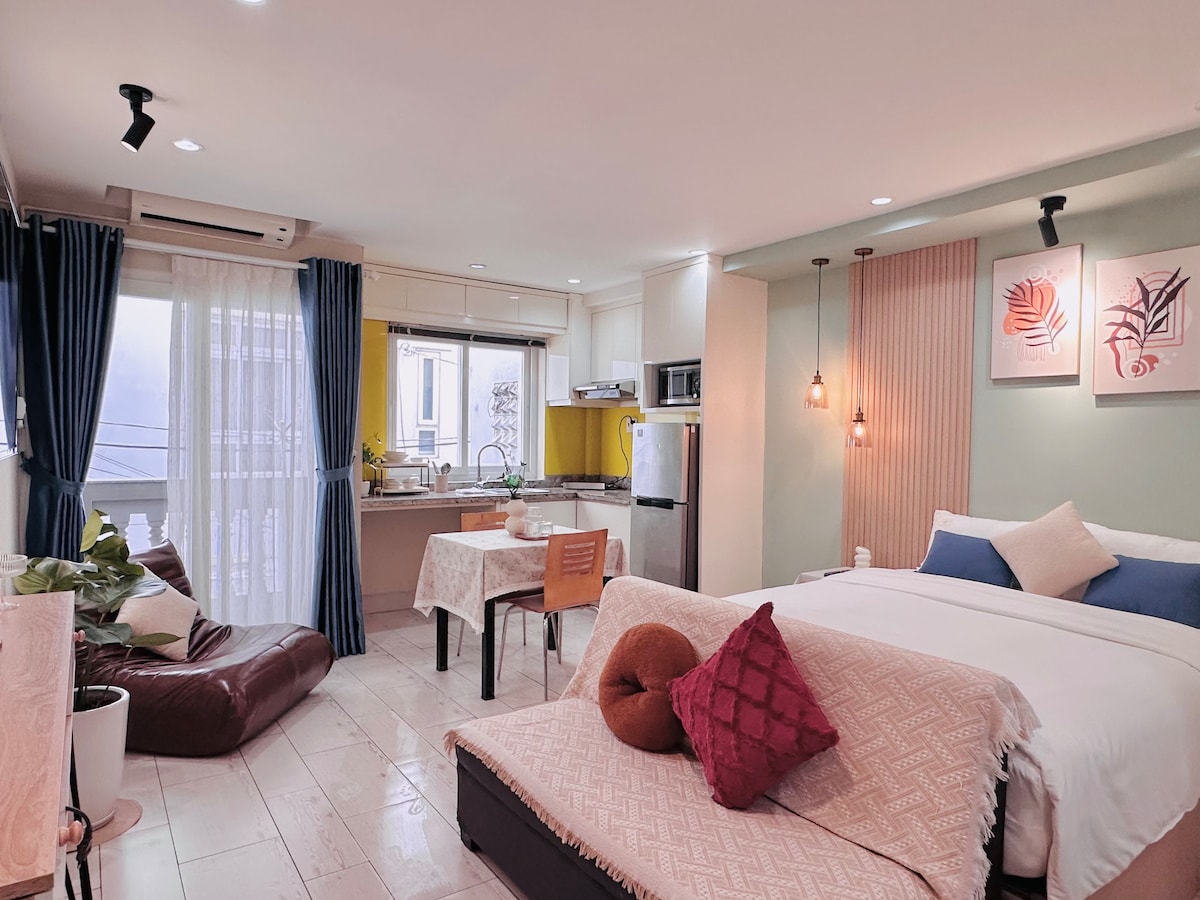 Velkommen til din urbane oase! Slapp av i leiligheten vår med ett soverom for to med en balkong med bred utsikt i Japan Town, bare fem minutter fra HCM-senteret. Restauranter, barer, kafeer, massasjesteder og nærbutikker ligger innenfor 1-200 meter til fots. I tredje etasje har Japandi-paradiset ditt alle fasiliteter. Ingen heis, men de brede og lette trappene er en gratis treningsøkt! 💪 Nyt en 100-tommers projektor for filmkvelder, en koselig 1,8 m sofa, et fullt utstyrt kjøkken og et forfriskende bad.