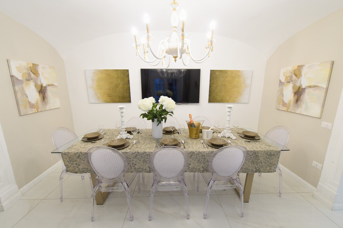 REDUCED RATES FOR STAYS FROM 7 NIGHTS. Residence is exclusive, prestigious, quiet, comfortable, safe. All the rooms, including the kitchen, are furnished in a sober and functional way, and enriched by paintings by Neapolitan painter Mariolina Amato who lived and worked there. Each room is different, the ideal place for a unique stay. The palace dates back to the 1500's: it dominates the pedestrian island of via Chiaia, the city's living room, and allows it to live it without noise of the city.