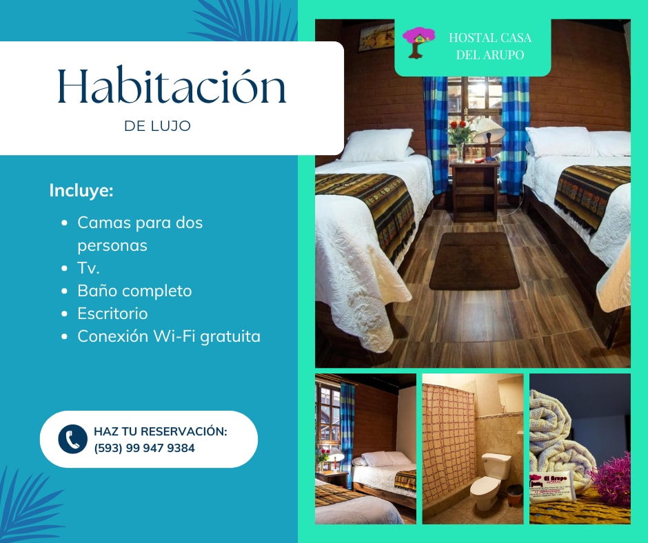 Leierom med eget bad ved siden av en tradisjonell andinsk landeiendom fra 1700-tallet som tar deg tilbake til kolonitiden. Rommet ligger ved siden av hovedbygningen der tjenestefolkets rom lå. Den har et kjøkken som er atskilt fra hovedrommet. Denne haciendaen fanger essensen av livet på landet. De store gårdsplassene, trebalkongene og de tradisjonelle arkitektoniske detaljene gir en unik opplevelse.