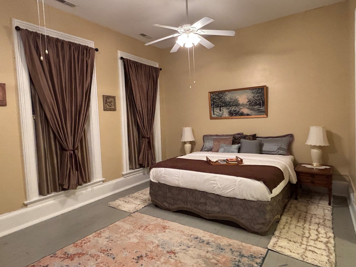 Wake up and take your coffee out to relax on the same veranda that Molly Brown (the “Unsinkable”) enjoyed when visiting her sister while watching the mighty Mississippi roll by. Built in 1844 by the first Judge in the territory, , Molly was headed to this house when the Titanic sank. Enjoy the original hardwood floors in the dining room, marked by embers of fires used to cook countless family meals under the hearth. Walk to all the downtown attractions, nightlife and festivals.