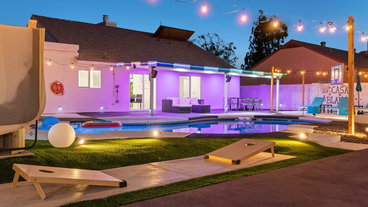 Gilbert Downtowns berømte restauranter ligger i nærheten. Dette huset er virkelig et underholdningsparadis. Tanken som legges i temaet vil overraske deg. Bakgården har cornhole-spill, air hockey-bord, bålplass, grill, svømmebad, boblebad, strenglys, sitteplass pergola og mye mer. Tre soverom, to kingsize-senger og to senger i full størrelse. Stor flatskjerm-TV, peis, familierom, spisestue, stue, arkaderom, 2,5 bad, vaskemaskin og tørketrommel, utendørs benkeplater, kvartsbenkeplater.