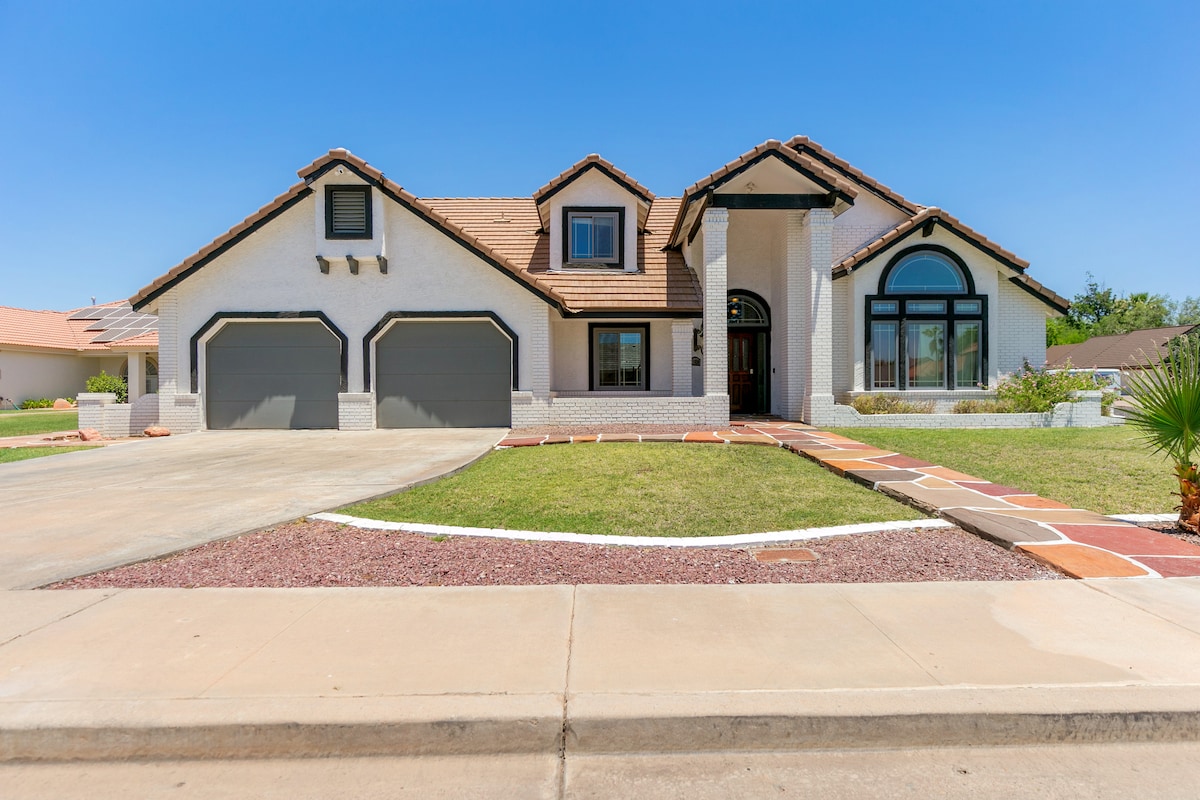 Slapp av sammen med hele familien på dette fredelige bostedet. God plass til alle for å nyte vakre Arizona. Fullt utstyrt kjøkken, romslig familierom med storskjerm-TV på 65 tommer, vennlig boligområde med tilgang til store motorveier i nærheten. Lettbane. nær ASU MCC. Tempe markedsplass. Tre soverom med queen size-senger og luksuriøst sengetøy (ekstra tilgjengelig). Hovedsoverom + TV-skjerm på veggen + fullt bad og ekstra fullt bad i gangen. vaskemaskin og tørketrommel