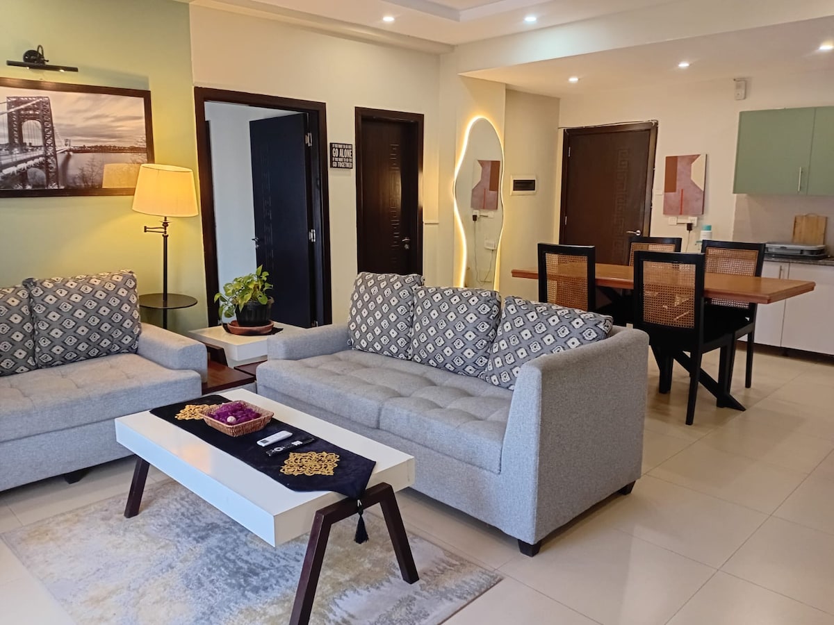 Velkommen til @blueoakresidences Romslig leilighet på 1500 kvm i F-11/1 Islamabad med to soverom med eget bad og privat balkong, toalett, UPS-backup, raskt trådløst nettverk, innsjekking uten vert og en 58" smart-TV. Kjøkken, varmt vann, gratis parkering og heis døgnet rundt er inkludert. For grupper større enn fire, er det to ekstra gulvmadrasser for opptil seks gjester. Babyseng er tilgjengelig ved forespørsel for tre eller flere netter (5000 PKR). Trinn fra Loafology, Nando's, Asian Wok, KFC, Al-Fatah. Familievennlig park rett utenfor.