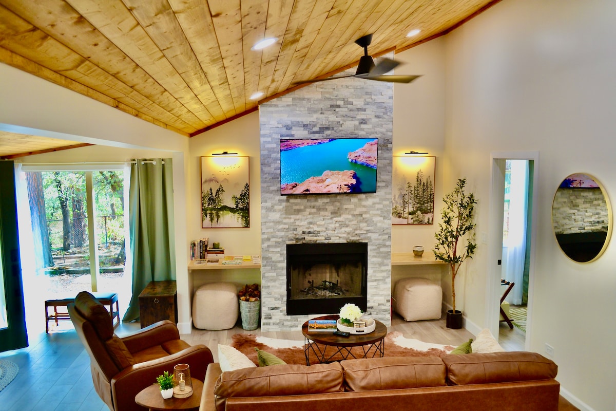 Kom og tilbring tid i Pines med hele familien eller i en intim setting for to. Fantastisk hytte med to soverom med en dyp skogfølelse, men bare en mile fra sentrum av Pine. MBR har en superkomfortabel posturepedic kingsize-seng og 50” HD Roku TV. 2. bdrm har full seng med komfortabel topper, et arbeidsområde, skriver og 42” HD TV. LR har vedfyring FP, 4 barkrakker og en stor 64" HD-TV med lydbar. Kjøkkenet har alt du trenger for å lage favorittmåltider. Uteplass i massevis med gassgrill, spisestue, sitteplasser for alle.