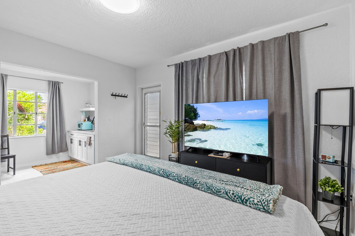 Stikk av til vår solfylte studio med ett soverom og ett bad, som ligger i en tropisk oase med ni hytter på den rolige Cyprus Ave. Dette frodige hagehuset ligger noen skritt fra Chapel by the Sea, og har svaiende palmer, to oppvarmede bassenger og en to-minutters spasertur til Clearwater Beach. Inne kan du nyte en frisk, moderne innredning, lyse aksenter og turkise detaljer som gjenspeiler havet. Fredelig og privat, men likevel i nærheten av butikker og restauranter, det er plettfritt og et koselig tilfluktssted for to