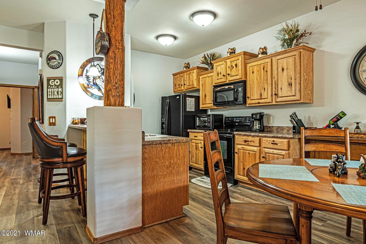 Denne vakre hytten ligger i furuskogen i Pinetop og er det ultimate familieferiestedet. Slapp av foran den koselige peisen eller lag s'mores over bålet. Ta en kopp gratis kaffe og kos deg! Ute på verandaen kan du kose deg på verandasvingen eller grille i bakgården mens barna leker i hagen, eller bare sitte og nyte det vakre været. Bare minutter fra mange stier, flere innsjøer, kasinoet og en kort 30-minutters kjøretur til Sunrise Ski Resort. Du kommer til å elske følelsen av denne familievennlige hytta.