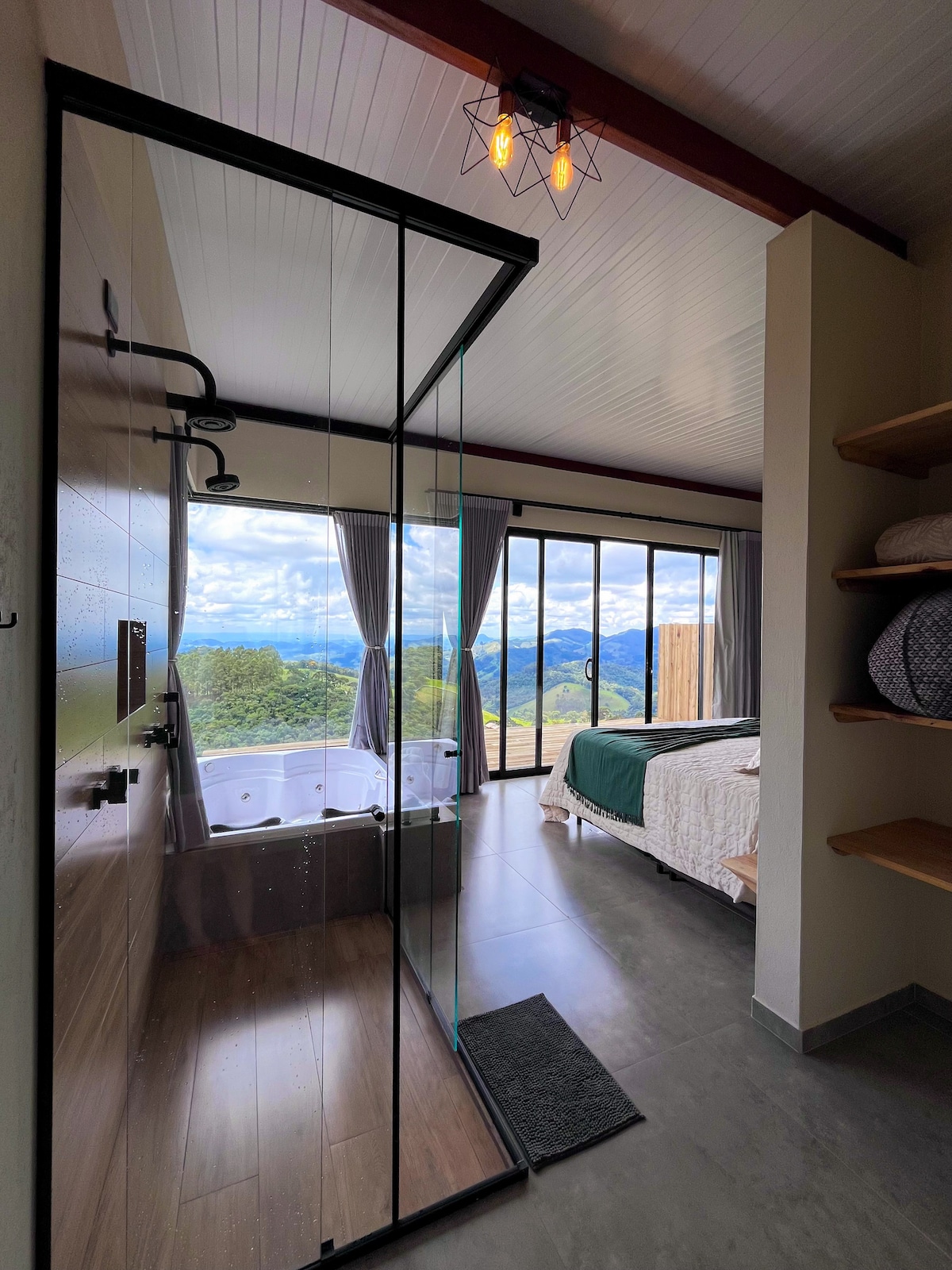 Cabana Nativa er en av de eksklusive overnattingsstedene i Alto da Galícia (@altodagalicia), som ligger i Atibaia-regionen, mellom Bom Jesus dos Perdões og Nazaré Paulista. En sjarmerende og sofistikert hytte omgitt av natur og med en fantastisk utsikt over fjellet. Med moderne arkitektur og naturlige elementer. Det steinkledde badet, den hengende peisen og de komfortable lenestolene skaper de perfekte omgivelsene for øyeblikk med hvile og samvær.