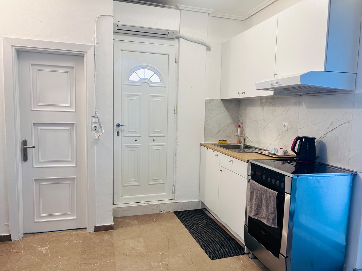 En toppleilighet på ca. 30 kvadratmeter med 1,4 meter dobbeltseng, dobbeltsofa, spisebord, kjøleskap, kjøkkenkrok, ren og komfortabel, ideell for par, med en stor privat terrasse hvor du kan nyte den greske solen. Det eneste dårlige er at stedet mitt ligger i 5. etasje, og heisen går bare til 4. etasje, så må du gå opp en etasje.