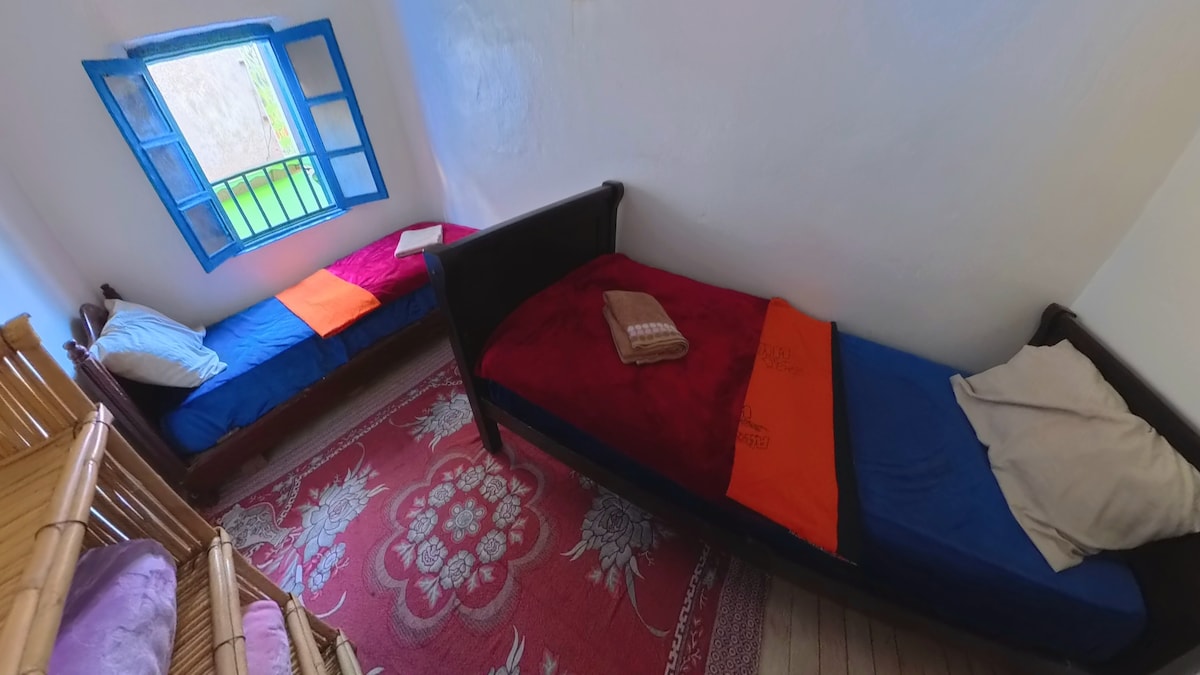 Nyt et koselig og privat dobbeltrom med fantastisk utsikt over Atlasfjellene og bassenget. Dette stedet har en komfortabel dobbeltseng og et eget bad, og tilbyr et fredelig tilfluktssted. Perfekt for par eller enslige reisende, det er det ideelle stedet å slappe av og nyte den naturlige skjønnheten rundt deg. Du vil ikke forlate dette sjarmerende, unike stedet!