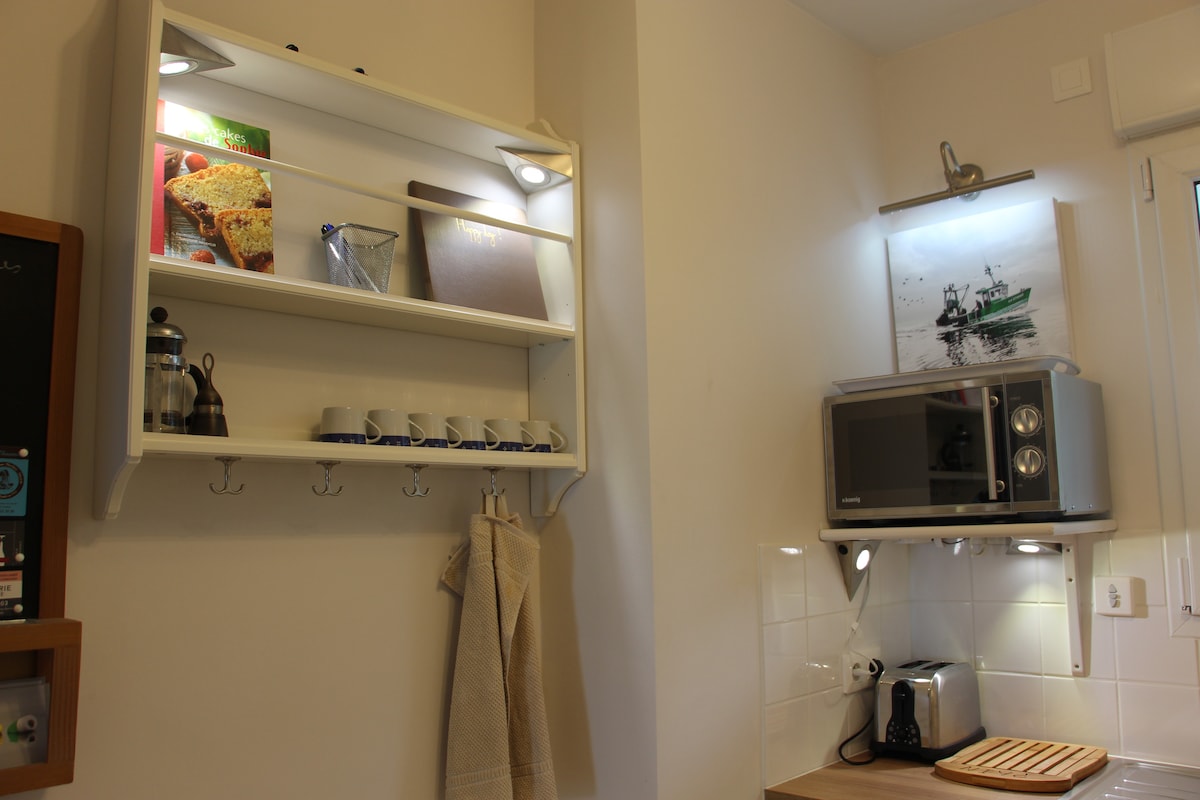 Oppdag den uovertrufne sjarmen til denne kokongen ved sjøen, plassert på klippen i Port l'Épine i Trélevern. Leiligheten vår er ideell for en romantisk ferie, og har komfortabelt plass til to personer og gir en fantastisk utsikt over den majestetiske Perros-Guirec-bukten. Denne privilegert beliggenheten gir deg direkte tilgang til sjøen og kyststiene.