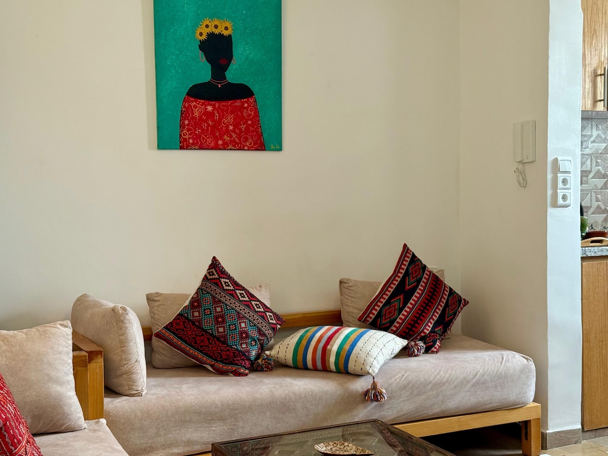 Varm og sjarmerende leilighet i hjertet av Essaouiras gamle medina! Har to lyse soverom med kingsize-senger, to private bad, en koselig stue og et lite, men praktisk amerikansk kjøkken. Bare noen skritt fra souker, kafeer og stranden. Nyt ultrarask fiberinternett (opptil 200 Mbps), perfekt for hjemmekontor eller strømming. ⚠️ Ikke tilgjengelig for ugifte marokkanske par.