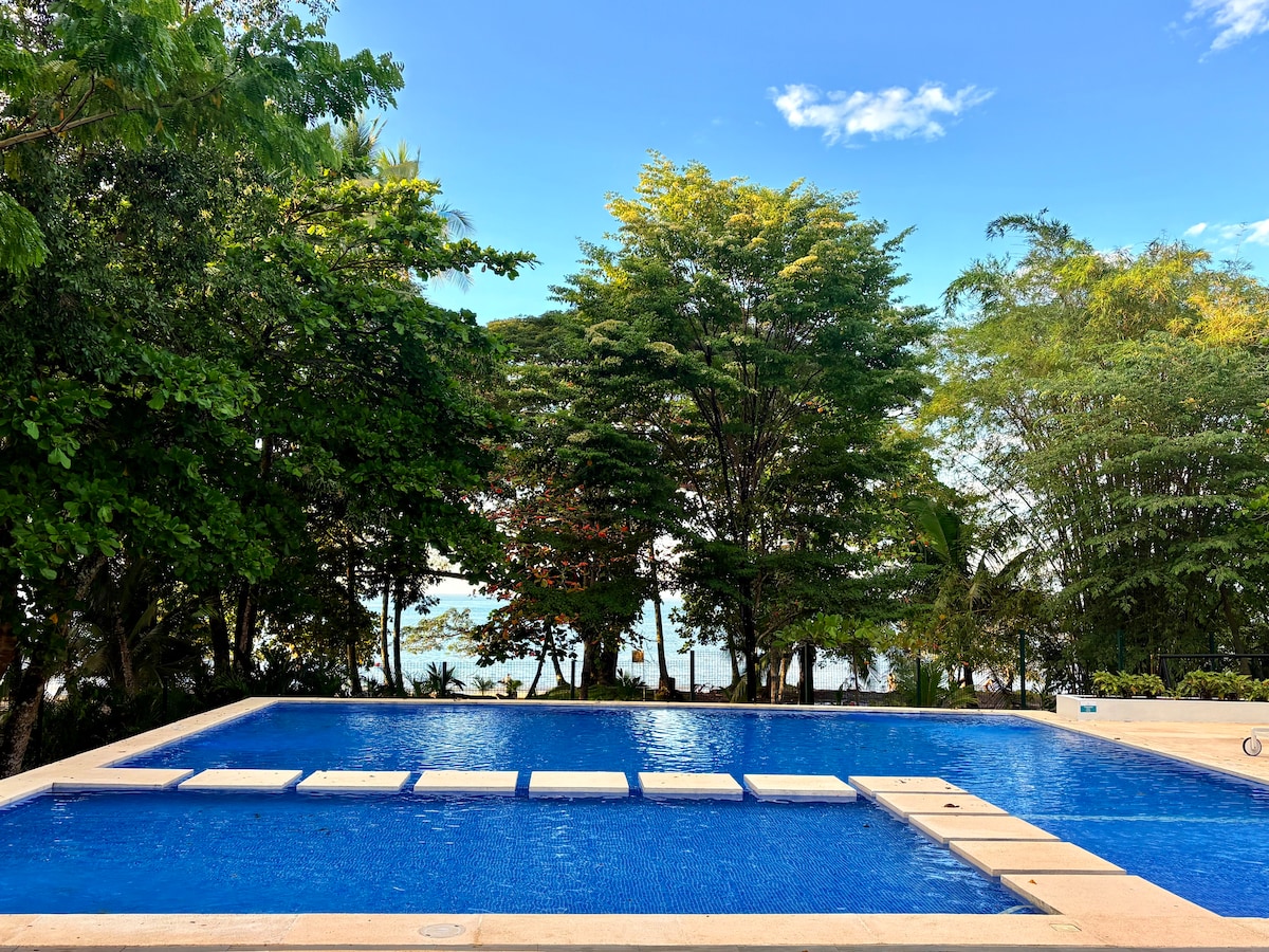 Beautifully renovated, penthouse right ON THE BEACH! Amazing ocean views with multiple balconies and PRIVATE roof top terrace. Gorgeous 3 tier pool area and fast WiFi with 2 Smart TVs. Just steps to the beach and 10-15 minute walk to dozens of restaurants and shops! Gated complex with 24/7 security. Tons to do in and around Jaco, everything from world class fishing and surfing to rain forest waterfall hikes, to ATV tours, whitewater rafting and zip lining, etc Enjoy the Pura Vida lifestyle 😊