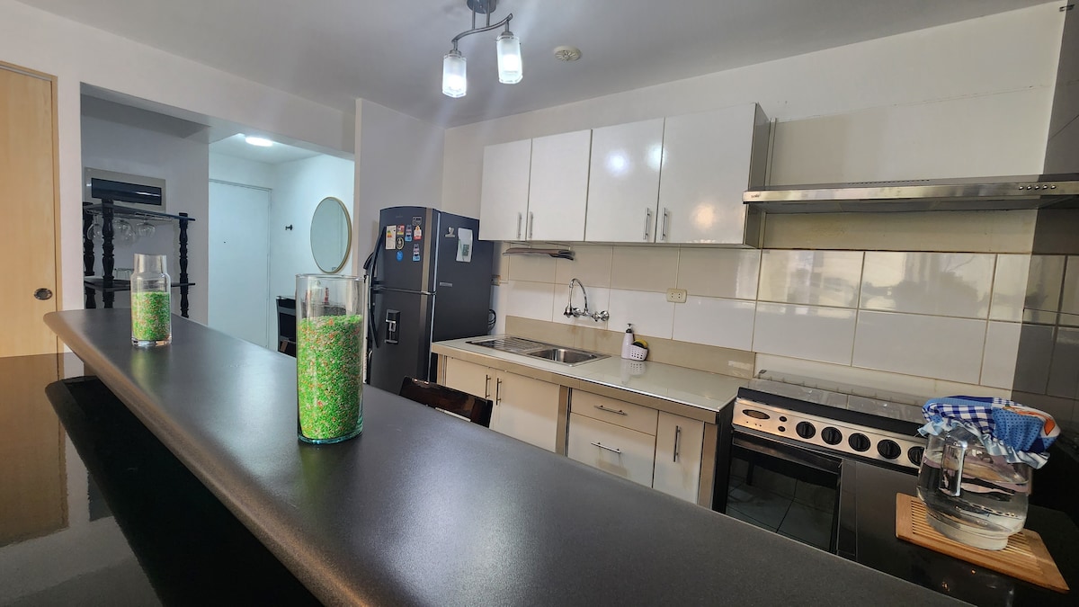 Moderne leilighet seks kvartaler fra Playa Blanca og Club náutico de P. Hermosa, med søt luksusfinish, 40 minutter fra Miraflores, Fjerde etasje, god utsikt, fullt møblert, har garasje og heis, enkel direkte tilgang til stranden. To komfortable soverom, to bad, varmt vann, to smart-TV-er, kabel-TV, kjøkken (mikrobølgeovn, airfryer, kjøleskap, møbler, bar osv.), fullt utstyrt balkong og terrasse med grill. Et sted å ha det gøy med venner, par eller familie.