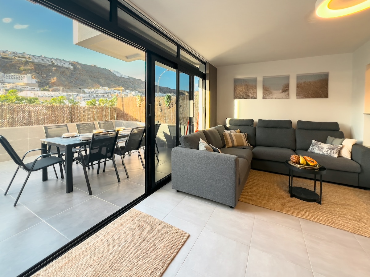 Puerto Rico er en av øyas juveler, og denne 2-etasjes leiligheten tilhører Puerto Rico. Etter en fullstendig renovering i november 2023, fikk leiligheten sitt harmoniske, men ekstravagante interiør som passer til omgivelsene. Herfra er det virkelig bare noen få skritt til sandstranden, utstyrt med parasoller og alle komfortfunksjoner, restauranter, kafeer, samt en festklubb, barne- og voksenvennlige bassenger og en cocktailbar.
