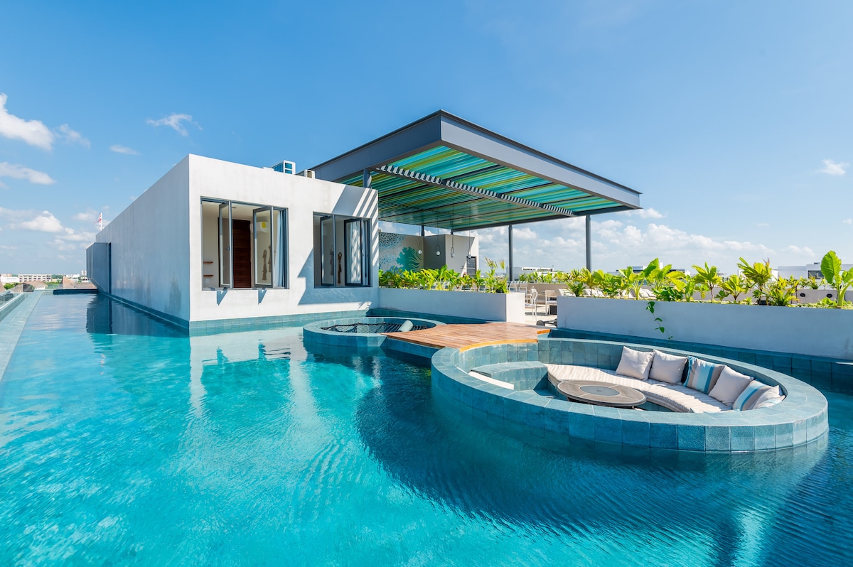 You will fall in love with your luxury penthouse set in the Diamond Zone of Playa del Carmen’s famous Fifth Avenue: Riad Aqua Waking up to ocean views, seeing the pristine shades of Caribbean blue from your private infinity pool and private rooftop. You will enjoy three beautiful bedrooms, each with its own private bathroom. You will feel the design, the calm, and the attention to detail in every corner. Come for the luxury, stay for how it makes you feel.