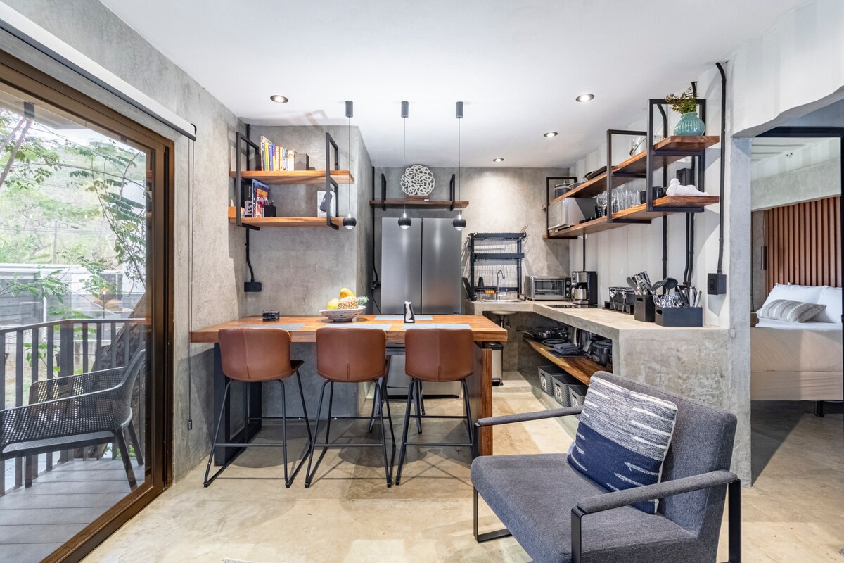 Fra denne beliggenheten på toppen av bakken over Tamarindo Bay, vil du nyte en panoramautsikt som er utrolig. Du vil se hva vi mener når du kommer hit! Casita tilbyr en kingsize-seng og en nedtrekkbar queen-seng, fullt utstyrt med et privat bad, kjøkken og en liten balkong med havutsikt og perfekt for å se aper i de omkringliggende trærne! Du har også tilgang til eiendommens sosiale område, inkludert en luftig, overbygd terrasse ved bassenget med havutsikt og takterrassen!