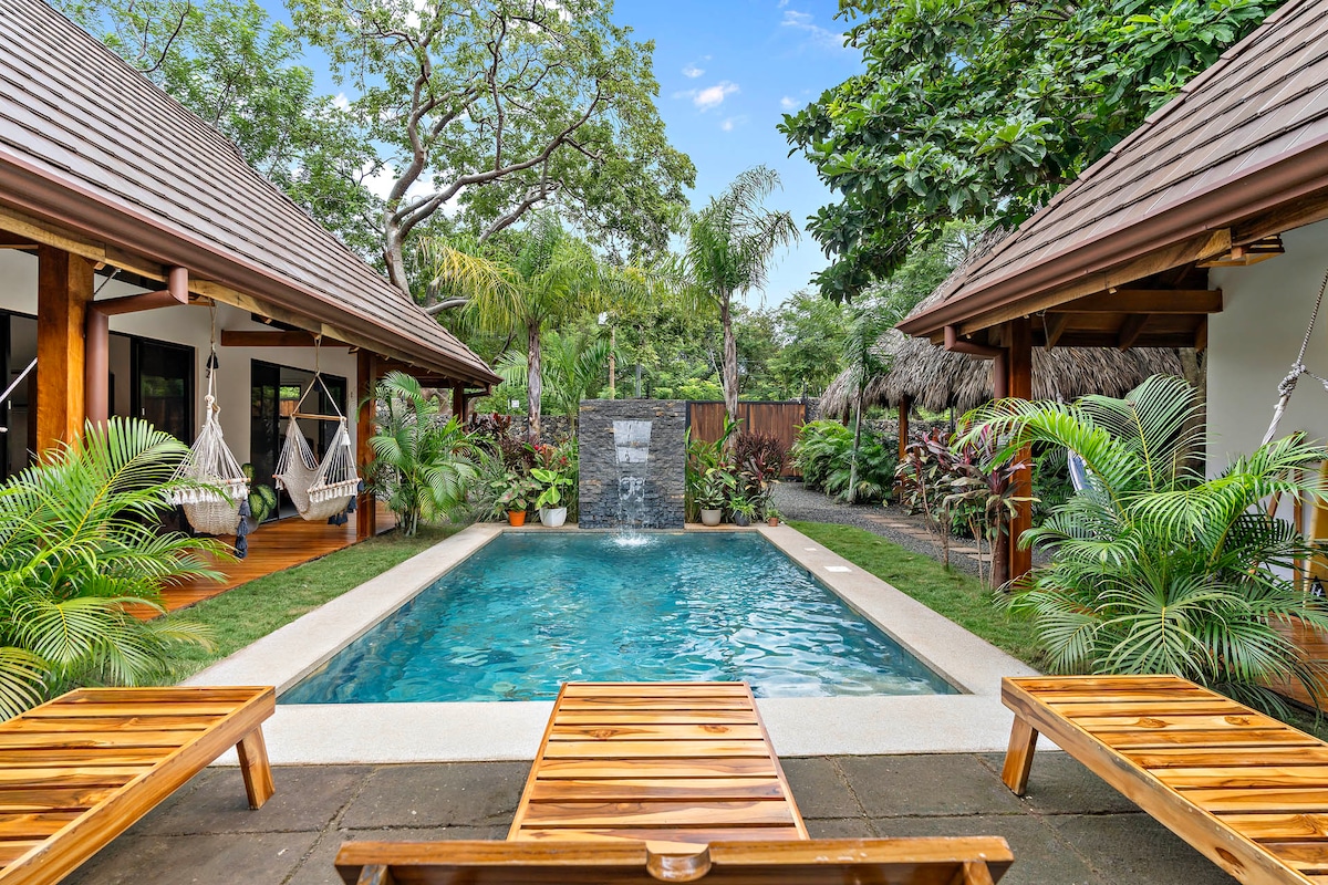 Reis til Tamarindo og bo på Villa Felina by Casa Leona. Dette boho-koloniale tilfluktsstedet har to soverom, to bad, et fullt utstyrt kjøkken, frodige hager og et felles basseng i rolige, private omgivelser. Beliggenhet i hjertet av byen, bare fem minutters spasertur til stranden, restauranter og butikker. Nyt gratis frokost hver morgen, i tillegg til basisartikler til stranden, som stoler, parasoller, håndklær, kjølebokser, snorkler med mer. Mer enn et opphold – en boutiqueopplevelse med hvile og diskré luksus.