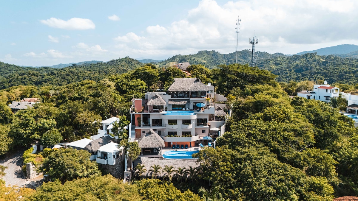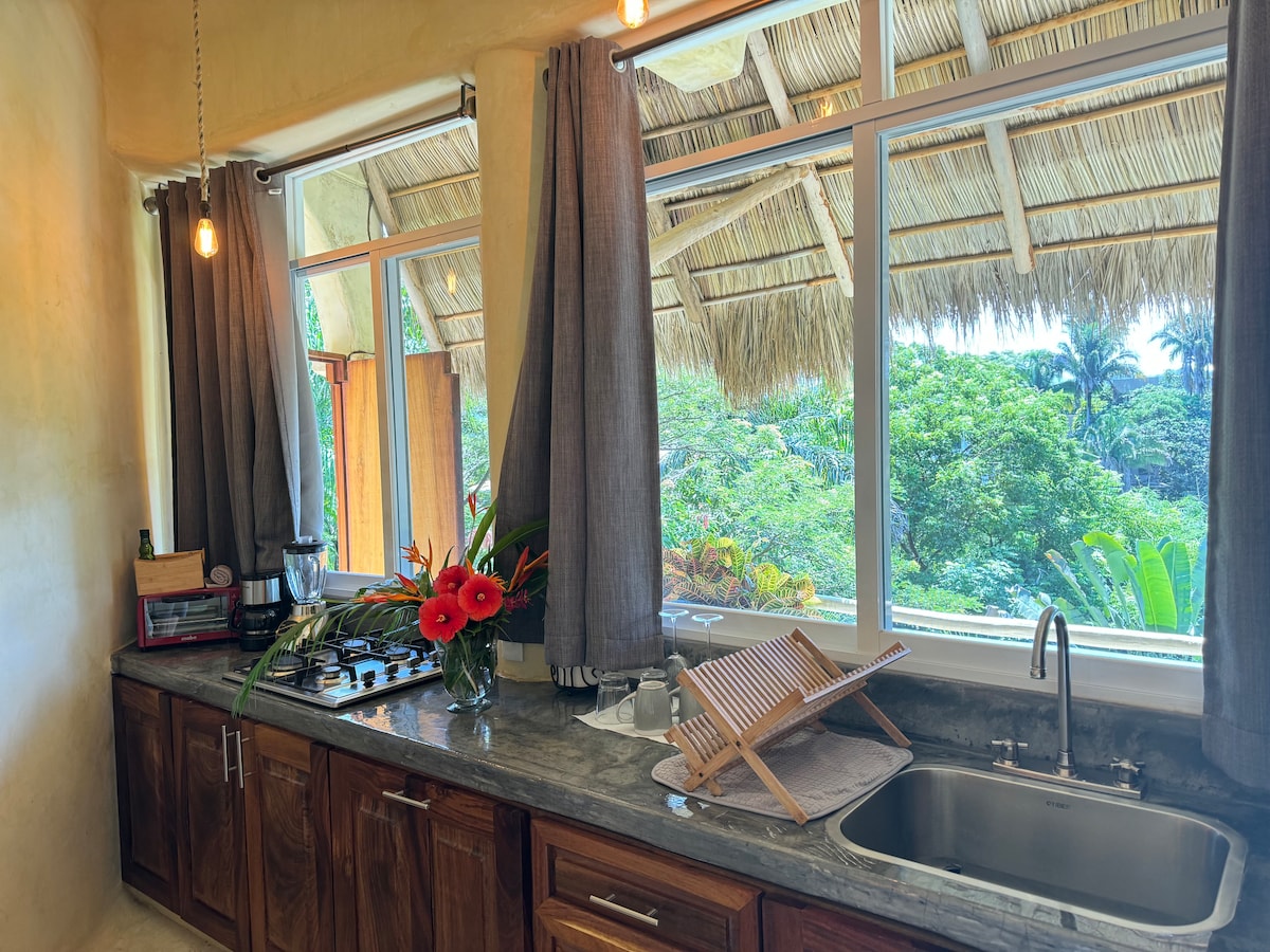 Mi Nido, åpent palapa-loft; tretoppene over havet