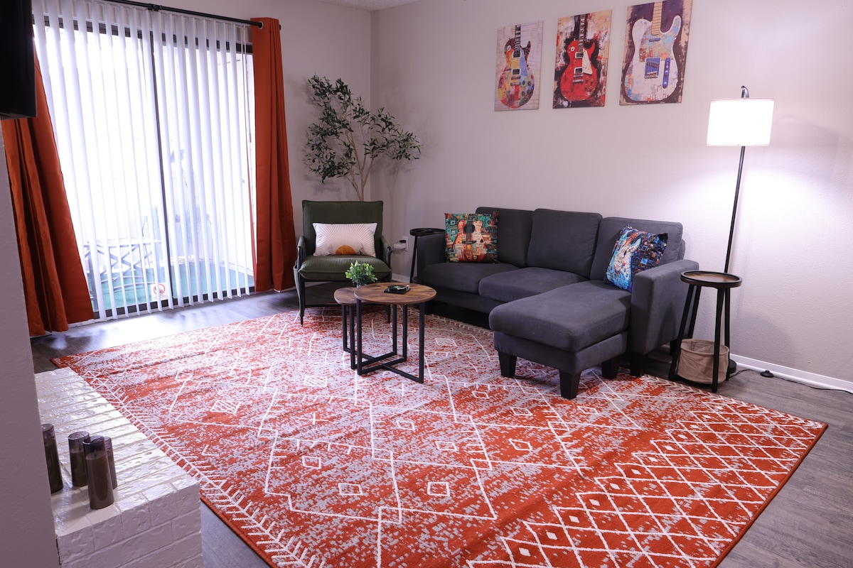 This 1 Bedroom with King Bed & Lounge L -Shaped Sofa is close to everything, literally walking distance to "live" entertainment music venues, premier shopping centers, restaurants, gas stations, HEB grocery all nearby. - 3 miles from Downtown Austin. - 4 miles from Moody Center. - 6 miles from Austin Airport. The 1 Bedroom is located on first floor with a beautiful view of downtown Austin!