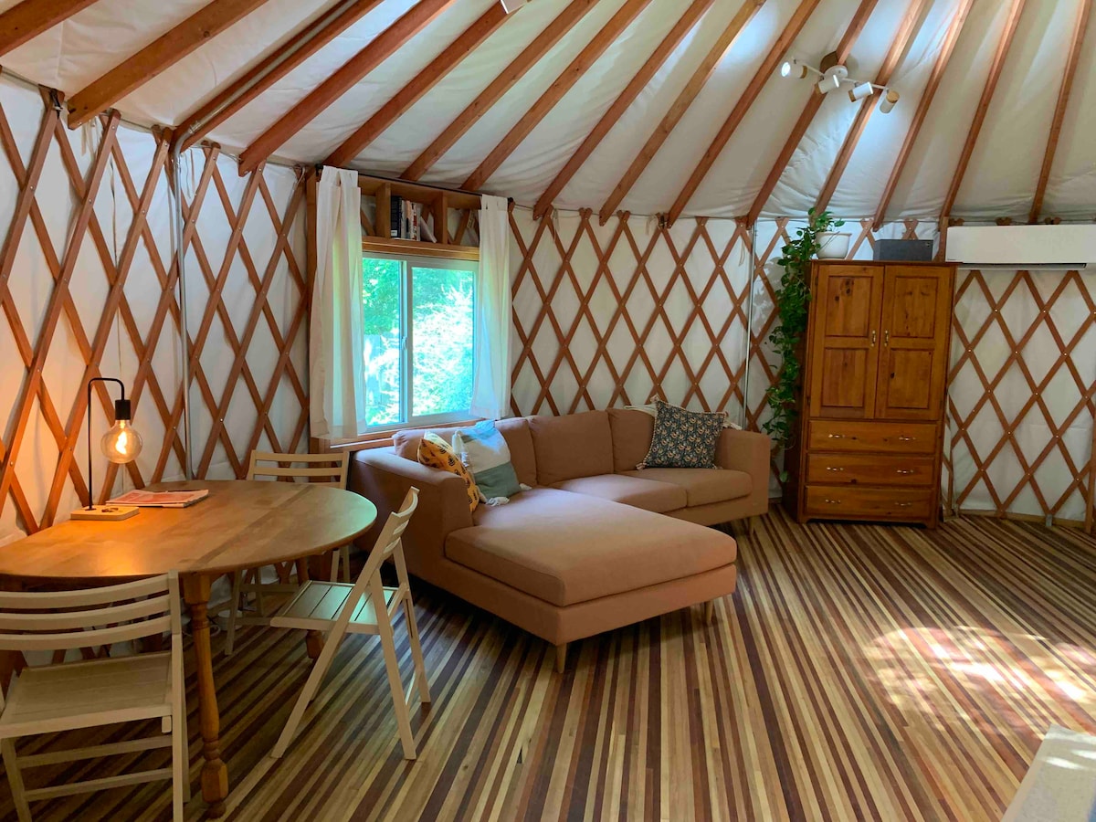 Du kommer til å elske å bo i dette håndlagde gjestehuset! Jurten er nøye plassert under seder-almetrær i bakre hjørne av hagen vår, 200 fot fra veien, med en privat inngang og personlig terrasse. Alt ved stedet er tilpasset. Studioet har et fullt utstyrt kjøkken, lynraskt trådløst nettverk og masse grøntområder. Vi er bare ti minutter fra sentrum, flyplassen og South Congress!