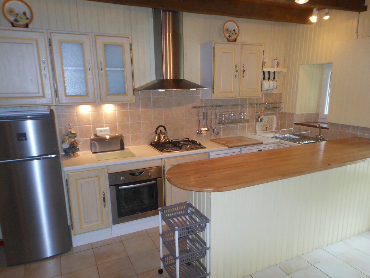 Denne hytta ligger i hjertet av en landsby, og har et hovedrom med kjøkkenkrok (induksjonsplater, blandet ovn, kjøleskap), en sofa, et bord (sammenleggbart) med 4 stoler, et bad, og et stort soverom på overetasjen, et bord som kan brukes til å jobbe (god wifi), en kommode, en garderobe. Mulighet til å spise ute, og bruke bassenget.
