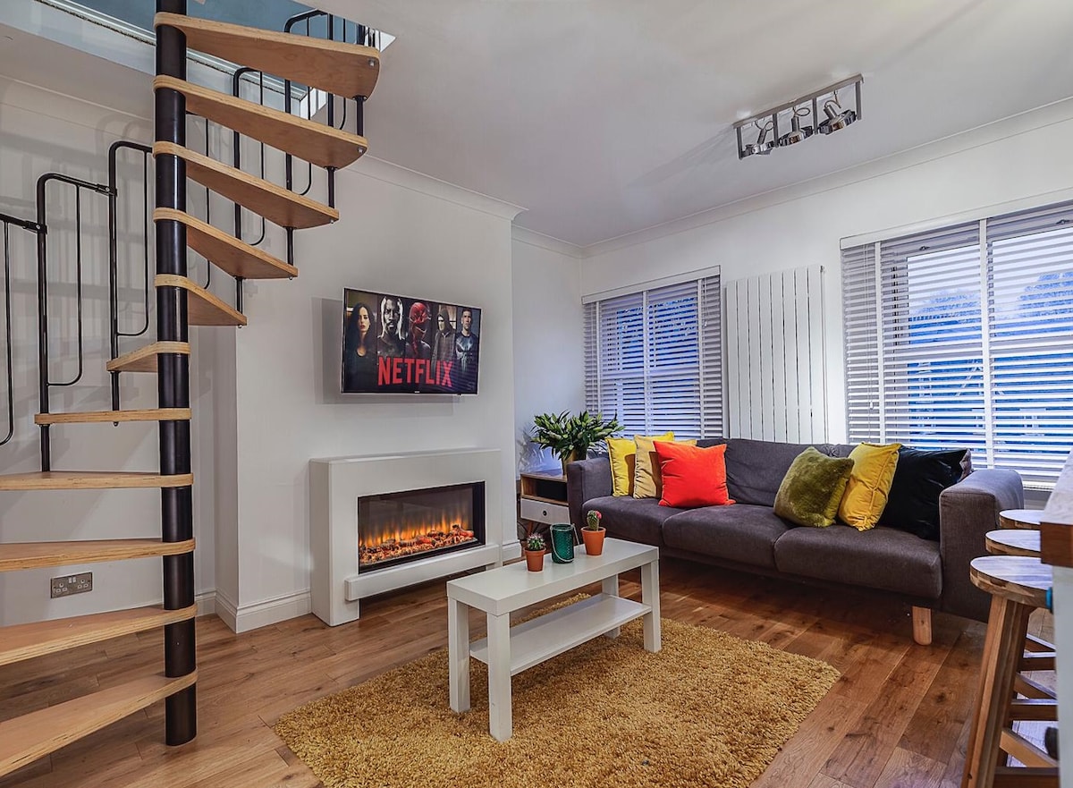 Opplev den perfekte blandingen av avslapning og eventyr i denne koselige, nybygde leiligheten med to soverom, bare 20 minutter fra O2. Den har tilgang til heis, privat balkong og USB-ladeporter. Dette stedet er perfekt for par, venner og familier, og det er ideelt for ferier, arrangementer eller bare for å slappe av. Super kingsize-sengen er en seng med glidelås, slik at den kan konverteres til to enkeltsenger på forespørsel. Gratis parkering er tilgjengelig etter først til mølla, på en sidevei ett minutts gange unna.