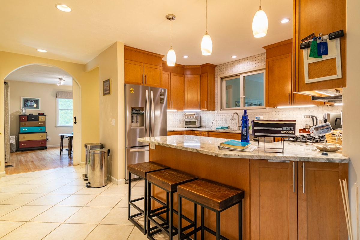 *generator, reservestrøm fra solcellepanel* Dette moderne huset i Cape-stil med fire soverom og to bad har ~2200 kvadratmeter på ett nivå i et rolig nabolag, gratis elbillading. 15000 kvadratmeter med inngjerdet, flat gressbevokst hage, bålplass, huskesett. Sentralt plassert i nærheten av Craigville Beach, Cape Cod Mall, livlige Hyannis sentrum og fergeterminal til Martha 's Vineyard og Nantucket Island Én stue, to spiseområder, fire superstore soverom. Perfekt for familieopphold og sammenkomst.