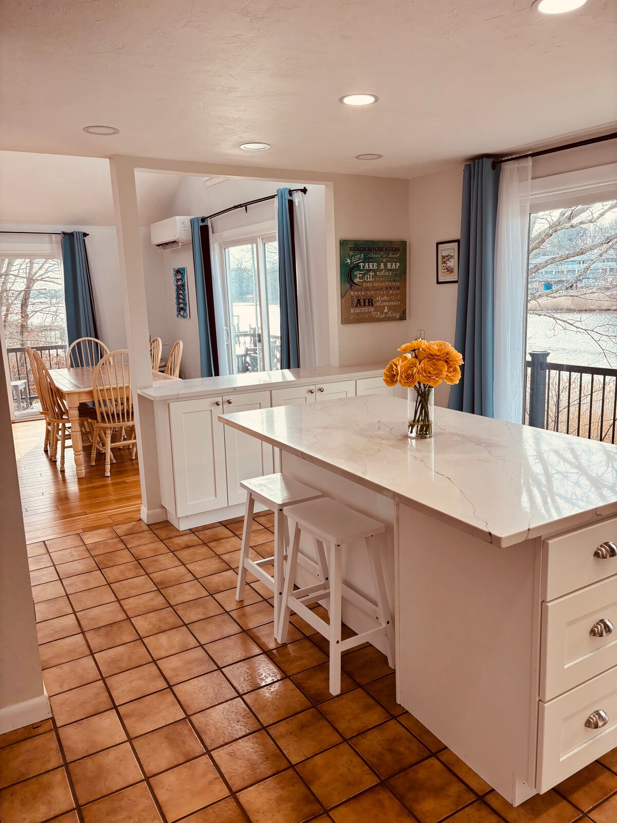 Hei, ferie! Første etasje i dette renoverte hjemmet har et nydelig kjøkken med en enorm øy som er ideell for matlaging, spising, å henge sammen og mer! Når du går opp trappen, finner du en vakker stue. Du kan nyte havutsikten herfra eller fra terrassen som ligger rett gjennom skyvedørene. Du finner også det overdimensjonerte soverommet som har havutsikt og en dobbel uttrekkbar seng. Huset vårt, Casa del Carman, venter på at du skal skape Cape Cod-minnene dine her! Spør meg om hytta!