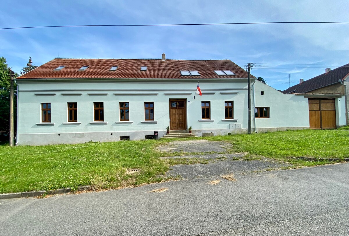 Huset vårt ligger tre km fra Nýrsko, i den rolige utkanten av Hodousice, omgitt av skog og enger – perfekt for å slappe av og nyte naturen. Den kan ta imot opptil 27 gjester i fire leiligheter med åtte soverom, fem bad, fire kjøkken og tre koselige stuer. Det er også en stor stue med peis, bord for felles måltider og et barnehjørne. Utenfor finner du en hage med terrasse, grill og lekeplass – ideell for familietid ute. Kjæledyr er ikke tillatt.