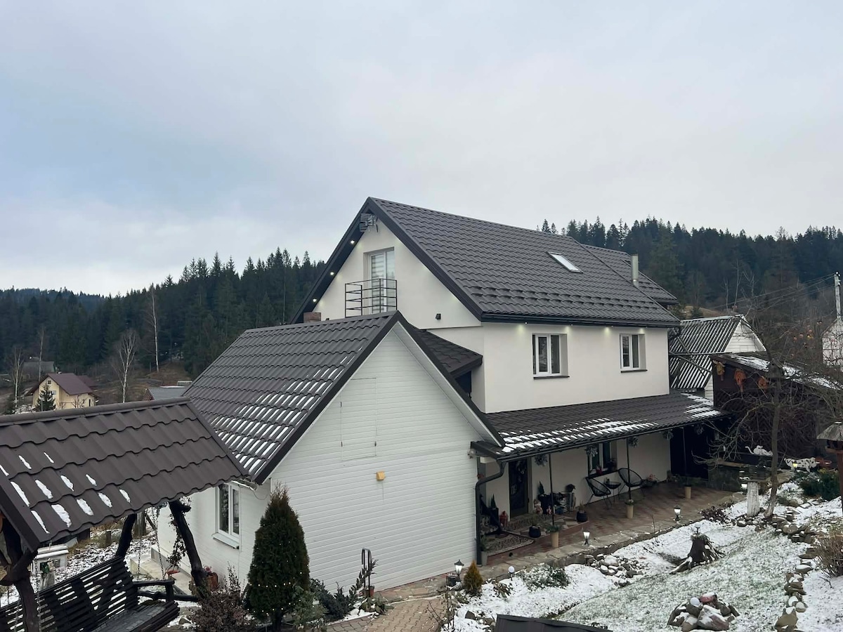 Koselig hus for 4 soverom, hvert med eget bad, det er en jacuzzi jacuzzi master bedrom. En romslig hall med peis, utstyrt med et kjøkken, et rom med en sauna med et minibasseng og en tralle, et skirom for oppbevaring og tørking av skiutstyr. Beliggenheten ligger i hjertet av Bukovel i nærheten av to trekk og Rodelban med utgang fra huset rett i skråningen. Naturskjønn utsikt fra vinduet i øvre bolig. Den har et grillområde med et stort tildekket lysthus og en terrasse, en garasje med en automatisk port. Koliba ligger 50 meter unna.
