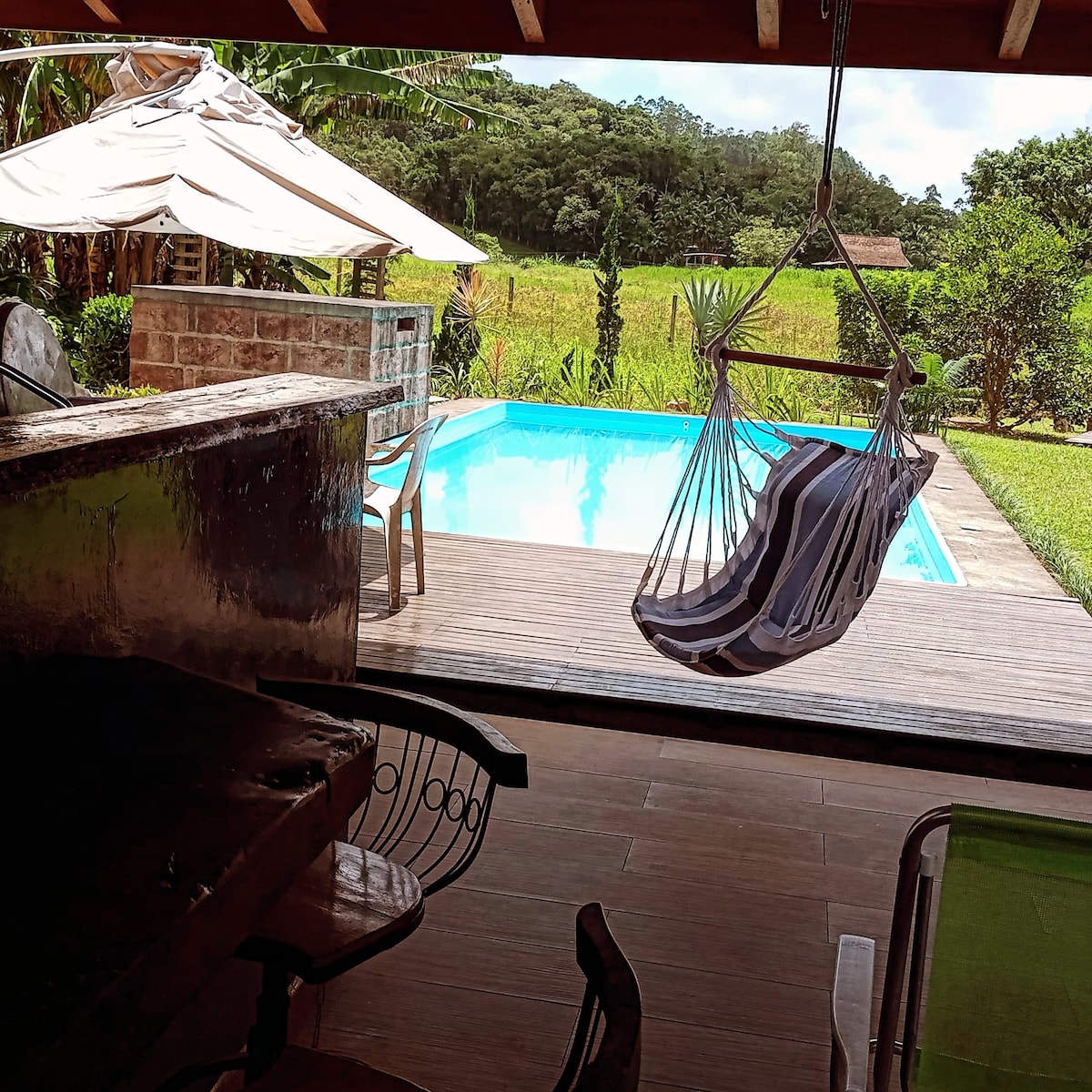 Sítio e casa completa localizada a 5,8 km (10 minutos ) do Zoo de Pomerode e das principais atrações e a 1,8 km do início a Rota do Enxaimel. Propriedade com lagoa, cama elástica, pebolim, mesa de sinuca, balanço, lareira externa e muito espaço para sua família, propriedade totalmente cercada. No segundo piso você encontra o apartamento com duas camas queen, guarda roupas, cozinha, fogão a lenha, rede, sofá e tv. O banheiro com chuveiro fica no piso térreo.
