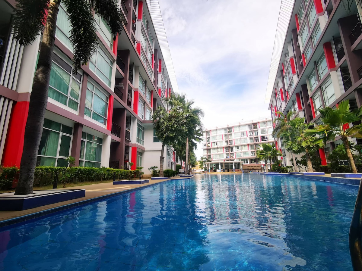 Denne leiligheten ligger i Jomtien Beach, Pattaya, med basseng og treningsstudio. Hvis du vil ha en lett luksus- og fritidsferie i Pattaya, er jeg sikker på å presse dette huset først for deg! - Uovervinnelig utsikt: Leilighet med utsikt over havet.Rett utenfor vinduet ditt er Jomtien-stranden, evighetshavet og solnedgangene i solnedgangen.Du kan også nyte en fantastisk utsikt over solnedgangen mens du slapper av hjemme ~ - Travle omgivelser: I nærheten ligger det travle nattmarkedet Jomtien Beach og Outdoor Children's Paradise, hvor du kan spise lokal mat sent på kvelden ~ - Praktisk transport: Enkel tilgang til overalt i Pattaya med songthaew.Floating Market, Teddy Bear Museum, Underwater World Pattaya, Siam Kwok 8 minutter, terminal 21 12 minutter Dette rommet med havutsikt anbefales definitivt for deg som ønsker å komme til Pattaya for en lett luksusferie og elsker havet!