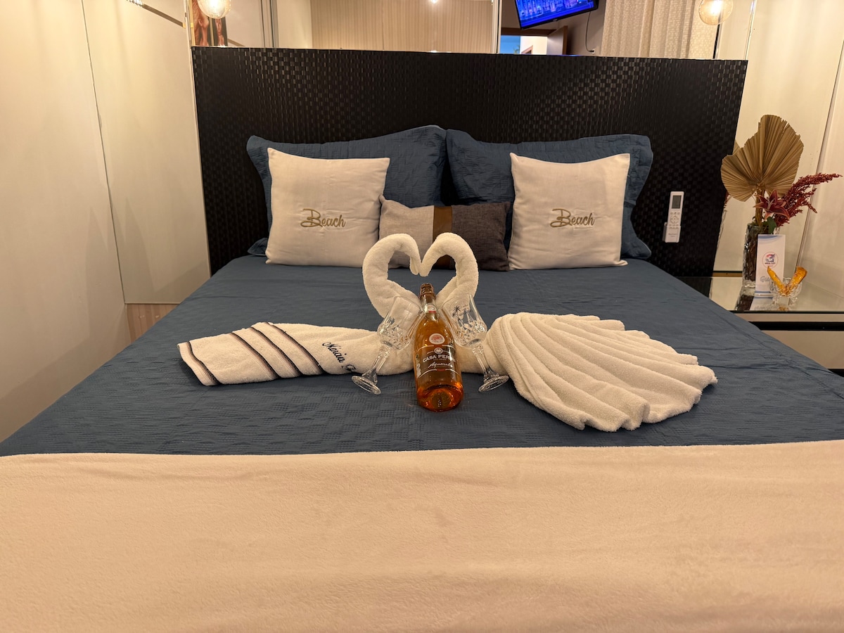 Bygningen vender mot stranden (fot på sanden), har svømmebassenger, grillplass (og grill), treningsstudio, spa (badstue og boblebad), to spillrom (tradisjonelle og for barn), leketøysbibliotek, fest- og gourmetrom (ikke inkludert), leserom, damelounge (som en skjønnhetssalong) og andre. 67,58 kvm leilighet med spisestue/stue, balkong, to soverom (ett suite), et gjestebad, kjøkken og vaskerom, trådløst nettverk, TV (smart), apparater, klimaanlegg på soverommene, garasje.