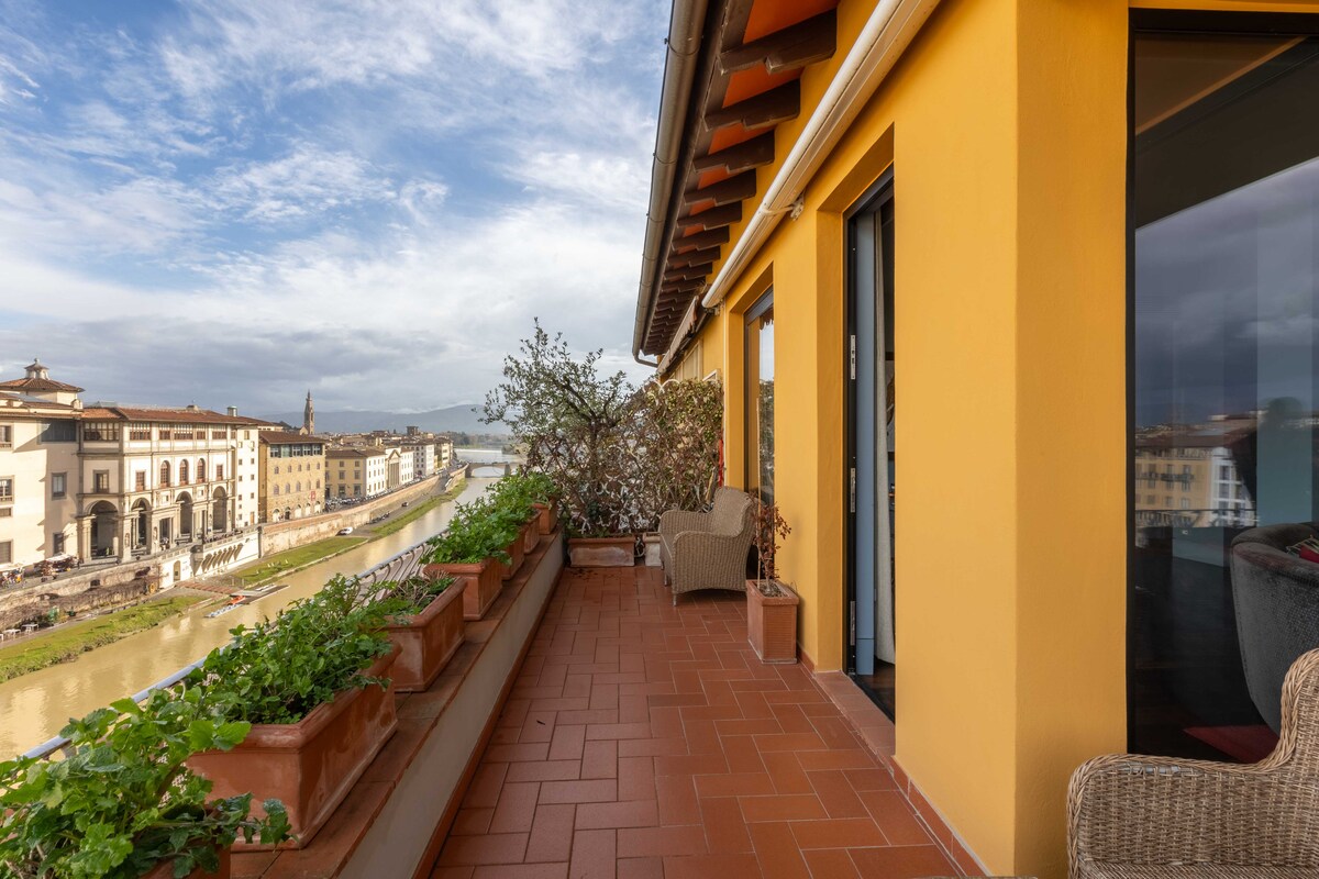 Vi er i Oltrarno, hjertet av Firenze, en eksklusiv beliggenhet ved siden av et av de mest historiske og berømte stedene i byen, "Ponte Vecchio". Terrassene i denne toppleiligheten tilbyr suggestiv utsikt over monumentene og takene i Firenze, noe som gjør den unik. Den eksepsjonelle, sentrale beliggenheten ligger innenfor gangavstand til alle større attraksjoner. For eksempel, fra Santo Spirito-distriktet, bare kryss Ponte Vecchio, og på fem minutter kan man være på Duomo eller Uffizi.