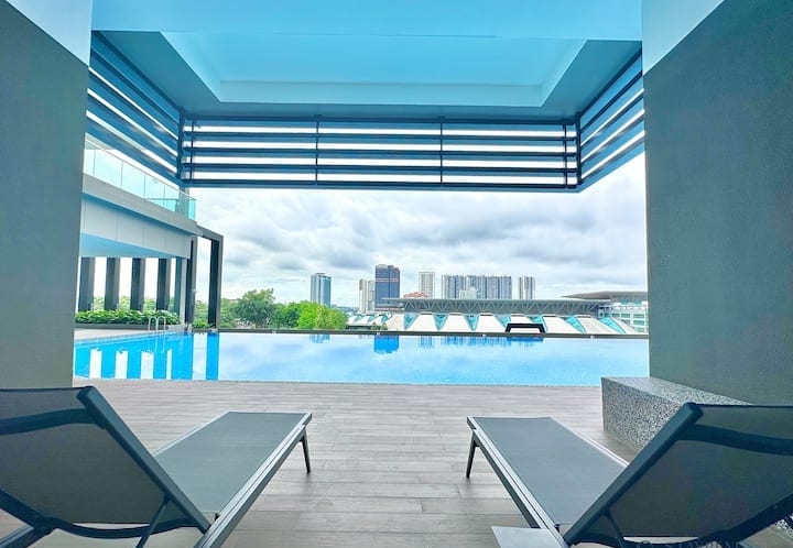 *NYHET* Send meg en direktemelding med ordet «Ny pakke» for å få 8 % cashback. Unn deg en pause i den stilige leiligheten vår med to soverom i 33. etasje i Johor Bahru. Dette moderne, minimalistiske tilfluktsstedet har fantastisk utsikt over byens skyline og har god plass til 6–7 personer. Stedet passer perfekt for familier eller forretningsreisende, og det har en HD-projektor med Netflix, trådløst nettverk (5G) med høy hastighet og et godt utstyrt kjøkken. Nyt en unik byferie med fasiliteter i feriestedstil.