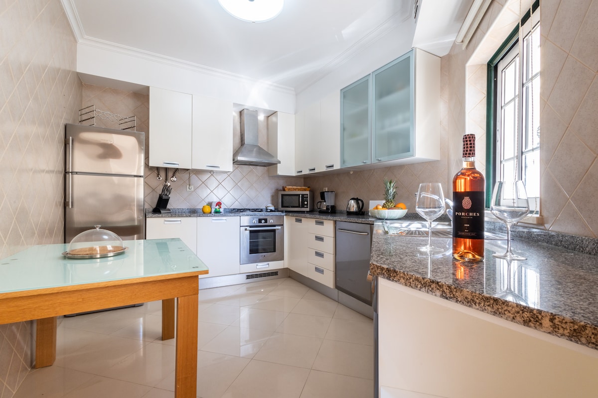 Leilighet med to soverom og to bad i Carvoeiro sentrum, i tredje etasje med heis. Fire sengeplasser, har kjøkken, vaskemaskin/tørketrommel, spisestue, stue med storskjerm-TV med Netflix og Amazon. Begge soverommene kan gjøres opp med enten (1) kingsize-seng eller 2 enkeltsenger, tilgang til balkong, takvifter og store skap. Hovedsoverommet har eget bad, og det andre badet er i gangen. Trådløst nettverk, bærbar barneseng og barnestol er inkludert. Privat balkong. Privat parkering i bygningen. Fire minutters gange til stranden.