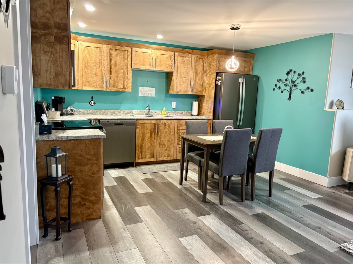 Denne romslige leiligheten med ett soverom er et flott hjem hjemmefra. Når du kjører inn på den private oppkjørselen for to biler, kommer du inn i denne nybygde leiligheten gjennom din egen private inngang. Når du er inne i enheten, går du ned noen trinn til et åpent stue-, spise- og kjøkkenområde. Leien inkluderer høyhastighetsinternett, grunnleggende kabel-TV, møbler, sengetøy, alle kjøkkenapparater og vaskeri.
