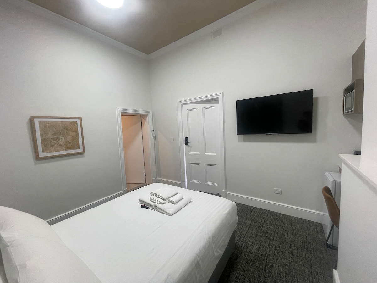 Welcome to standard room located on the ground floor and within the external wing of the Hotel. This inviting smaller room is designed for travelers seeking a comfortable and budget-friendly accommodation option. Including a double bed, TV, microwave, bar fridge and coffee machine. Beautifully designed modern bathroom with shower. Please note our rooms are located on the ground floor. All rooms include off street parking.