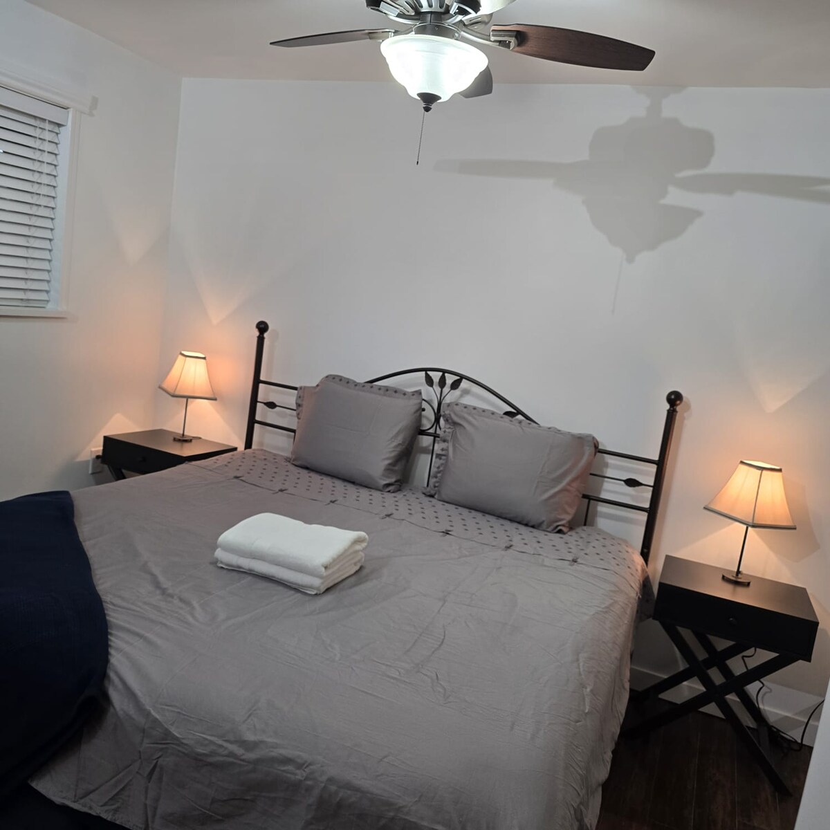 Velkommen til vår nyrenoverte, selvstendige suite, praktisk plassert i nærheten av sentrum og attraksjoner. Med egen inngang kan du nyte privatliv og fleksibilitet. Suiten ligger i kjelleren i første etasje og har rikelig med naturlig lys. Inne finner du et koselig soverom med en queensize-seng og en dobbeltseng med gardiner for privatliv. Stuen har også en sovesofa for ekstra soveplass. Hold kontakten med gratis trådløst nettverk og parkering i det trygge nabolaget.